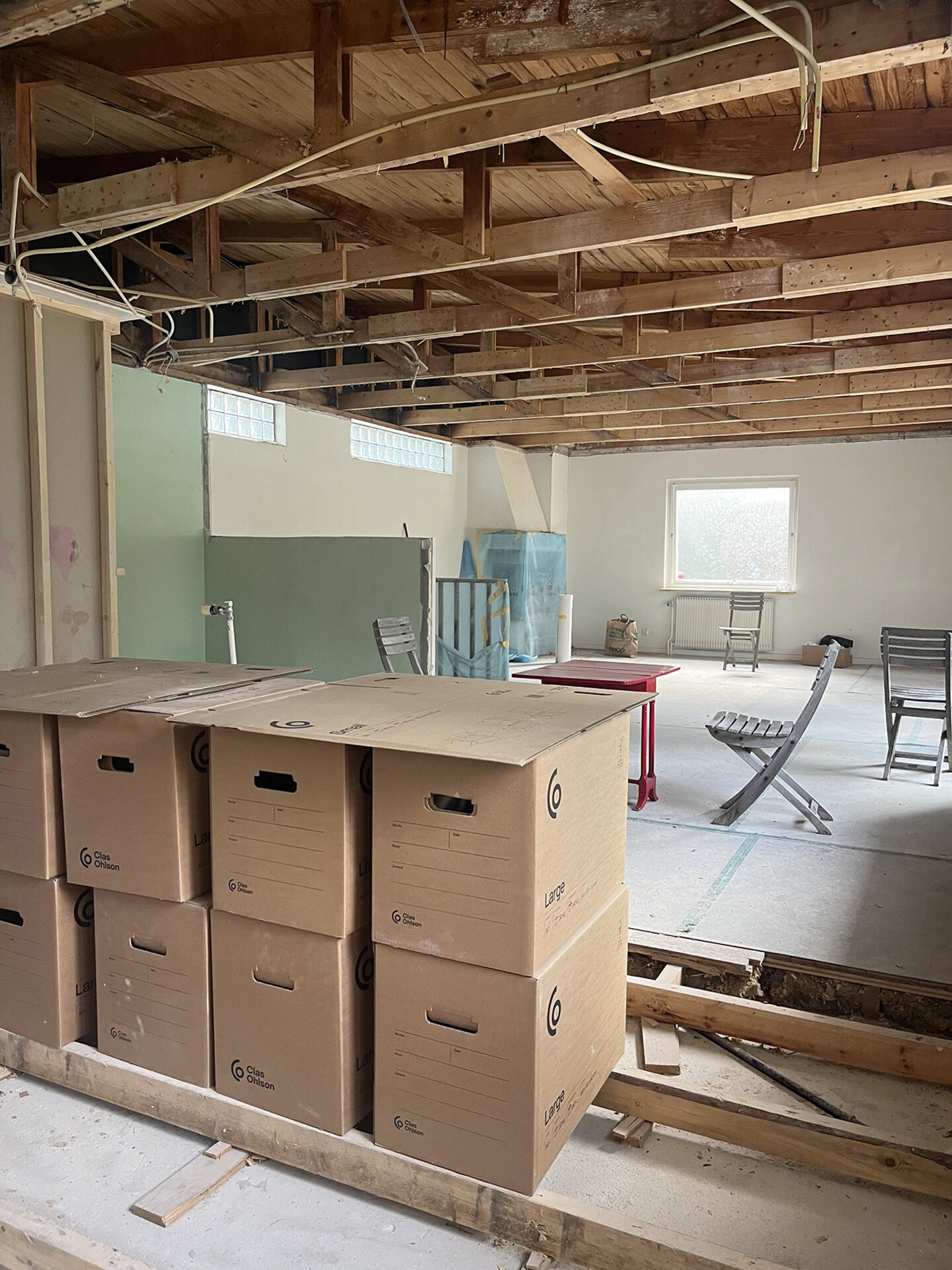 Veggene til vaskerommet og skapet ble revet for å få mer plass til det nye kjøkkenet.